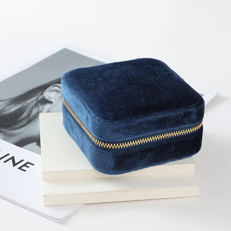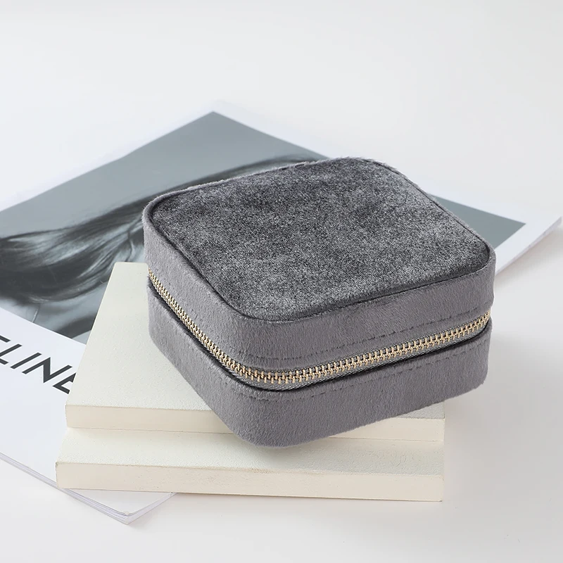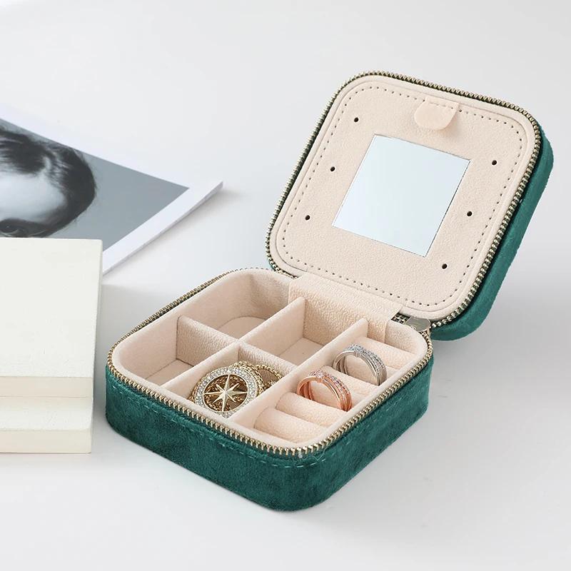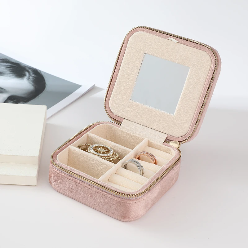 Custom Logo Portable Fashionable Square Shape Jewelry Box with Zipper Travel Velvet Jewellery Storage Packaging Box with Mirror