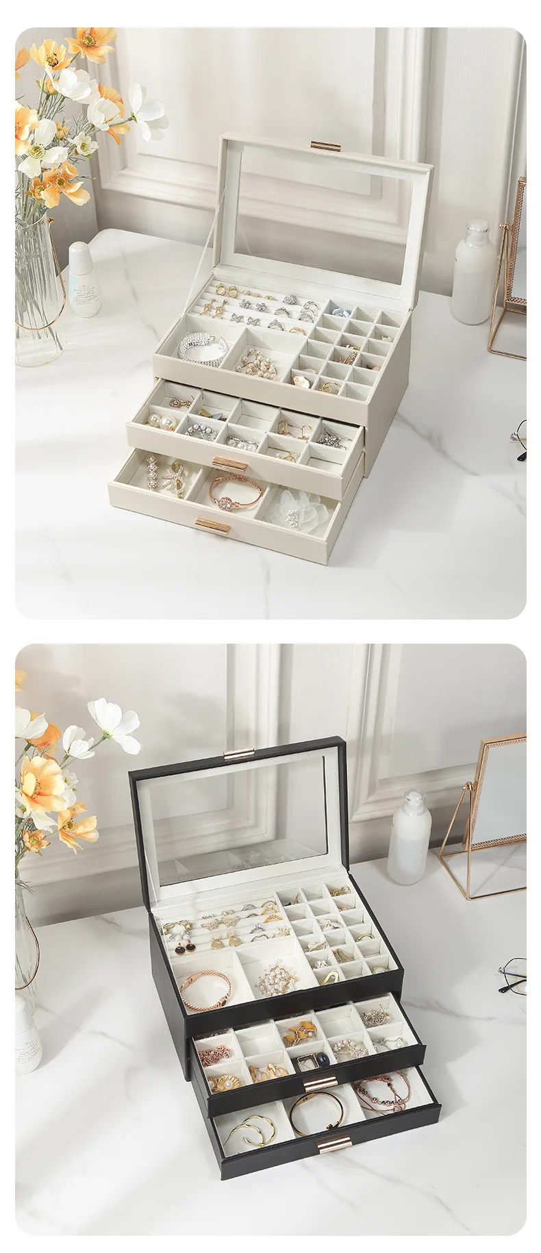 Custom Rectangle 3 Tiers Leather Jewelry Case Storage Display Organizer Makeup Trade Shows Cases with Drawer