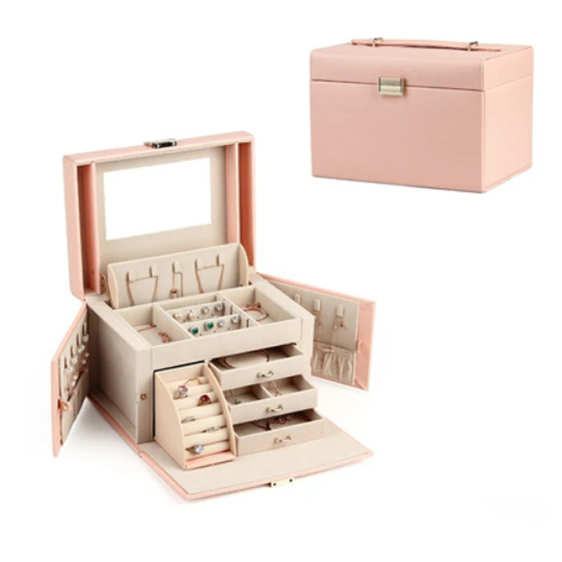 Wholesale Luxury Large Multifunctional Leather 3 Layers Necklace Bracelet Earring Ring Jewelry Storage Organizer Case with Lock