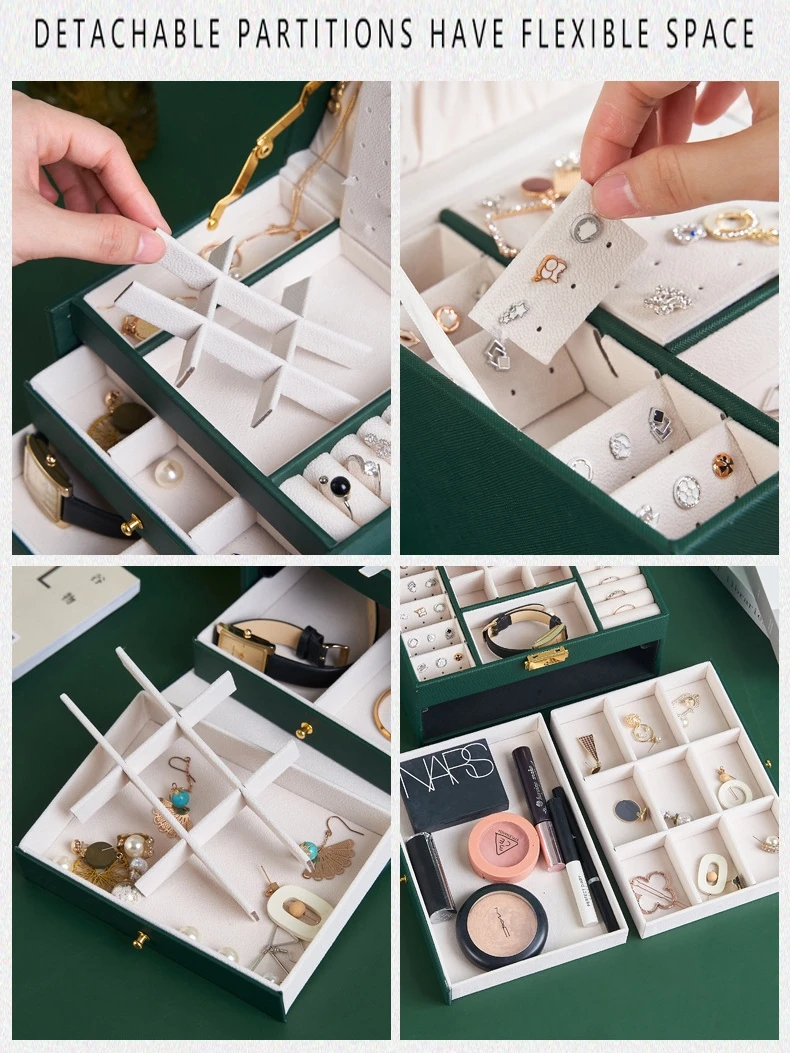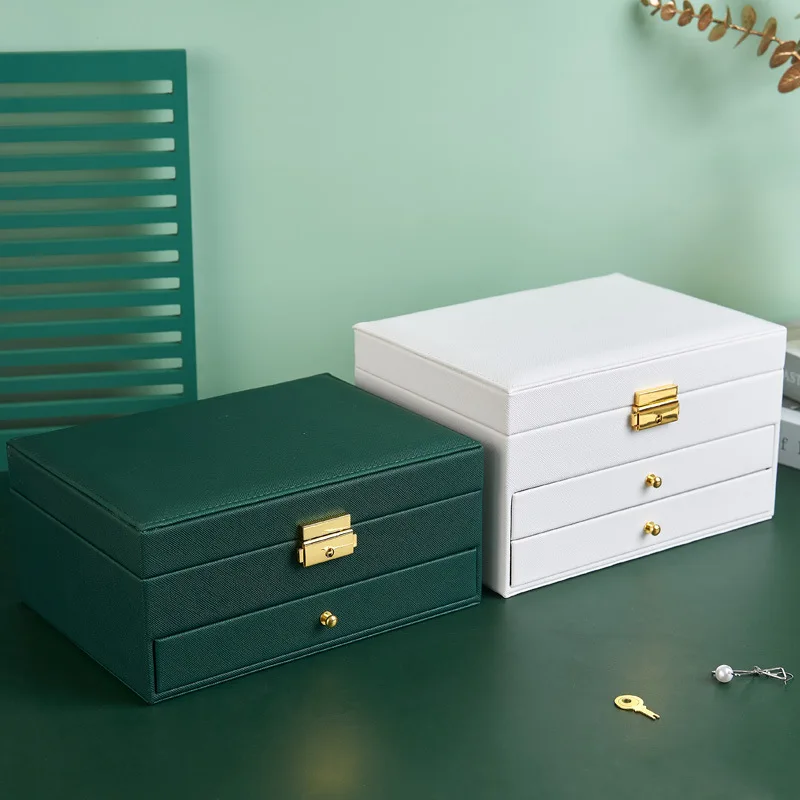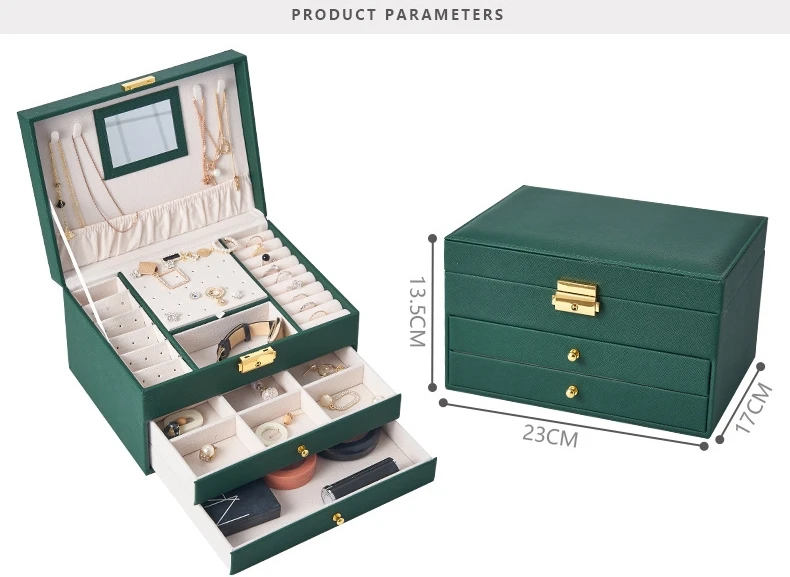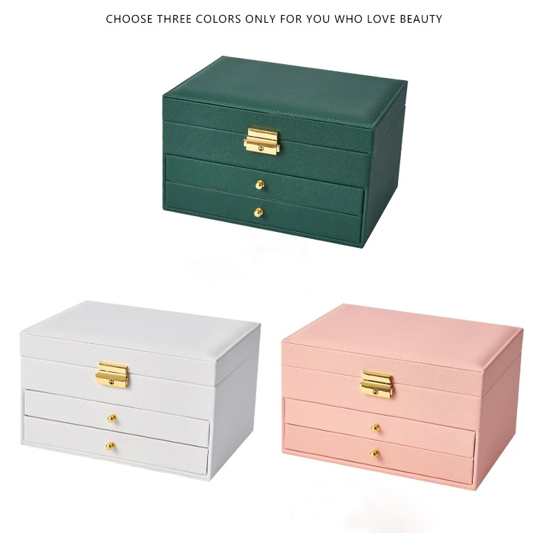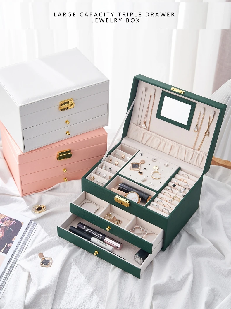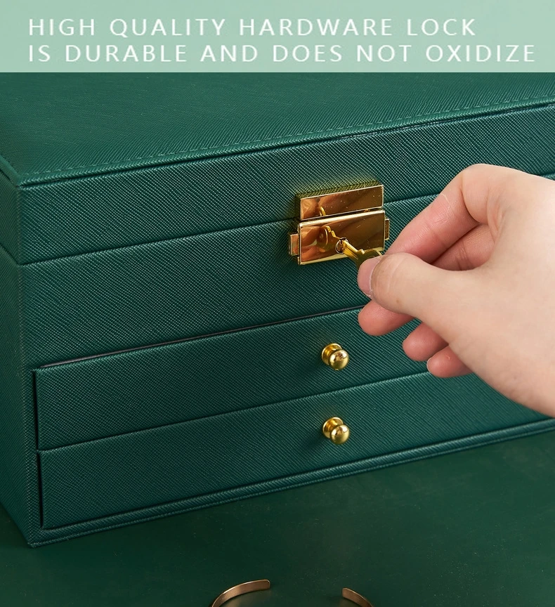 Green Pu Leather Multi-Function Three-Tier Jewelry Storage Jewelry Box Earring Storage Show Cases With Drawers