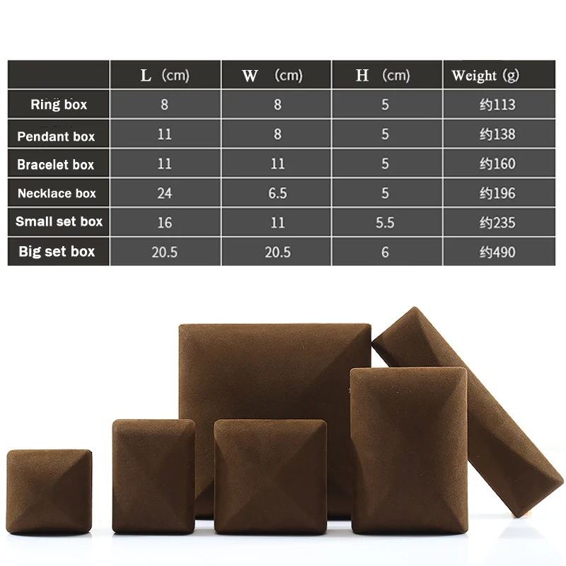 | Color | Ring box, Pendant box, Bangle box, Long chain box, Small set box, Large set box |